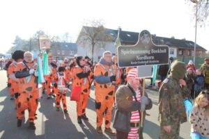 Nach dem Mittag ging es dann zum Festumzug durch Bookholt. Immer noch dabei die „Blanke“ Spielleute. Auch dabei war der Spielmannszug Lage sowie der Spielmannszug der „Freiwilligen Feuerwehr Bad Bentheim“. Auf dem Festplatz fand ein Konzert durch die Spielmannszüge statt.